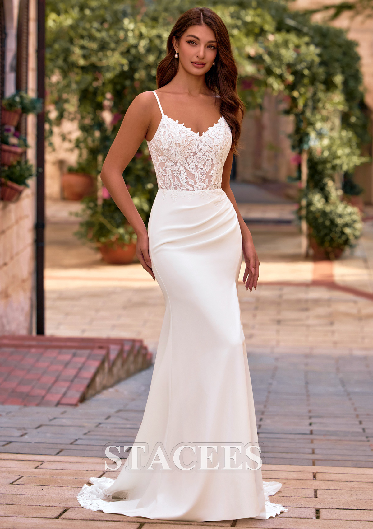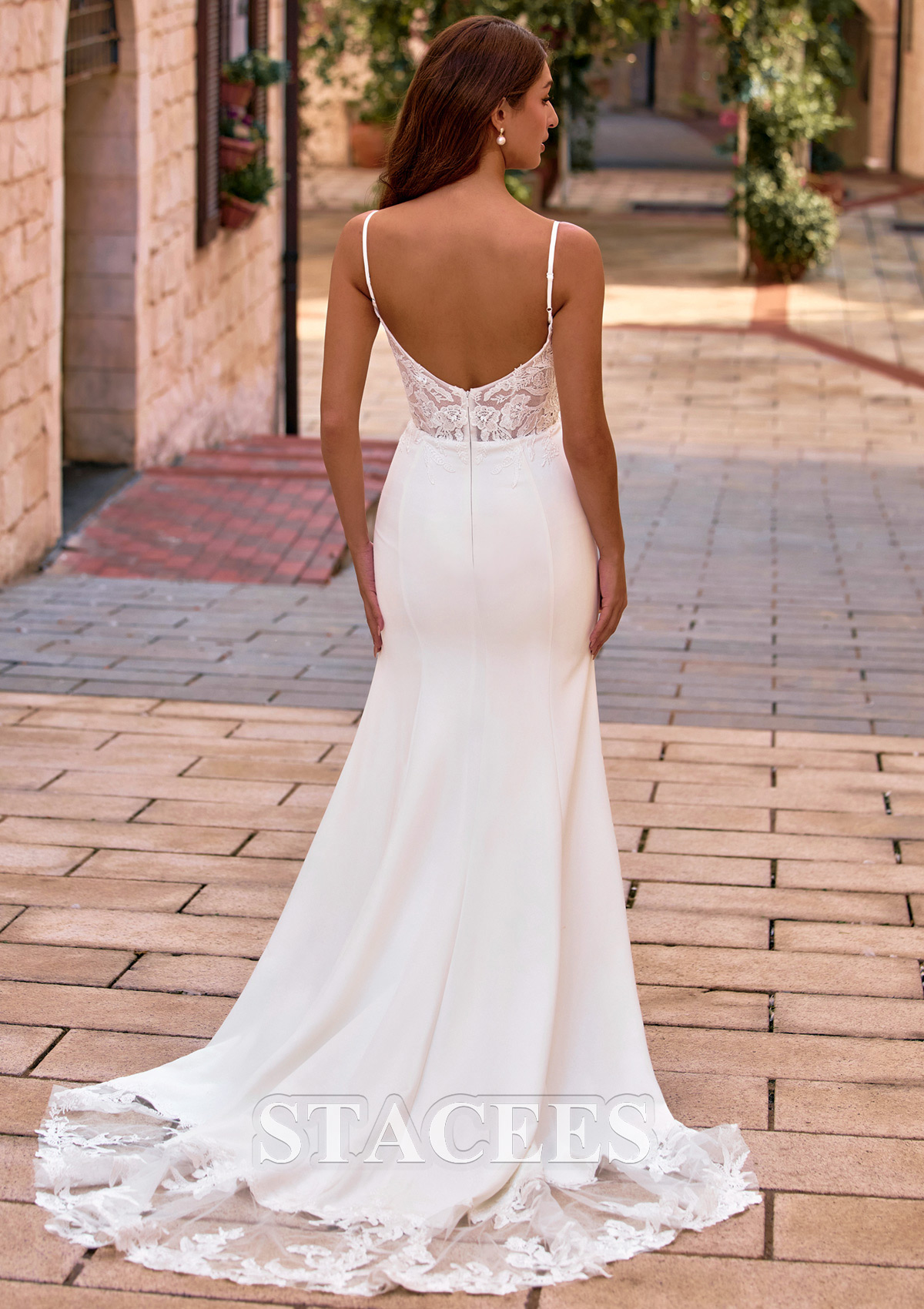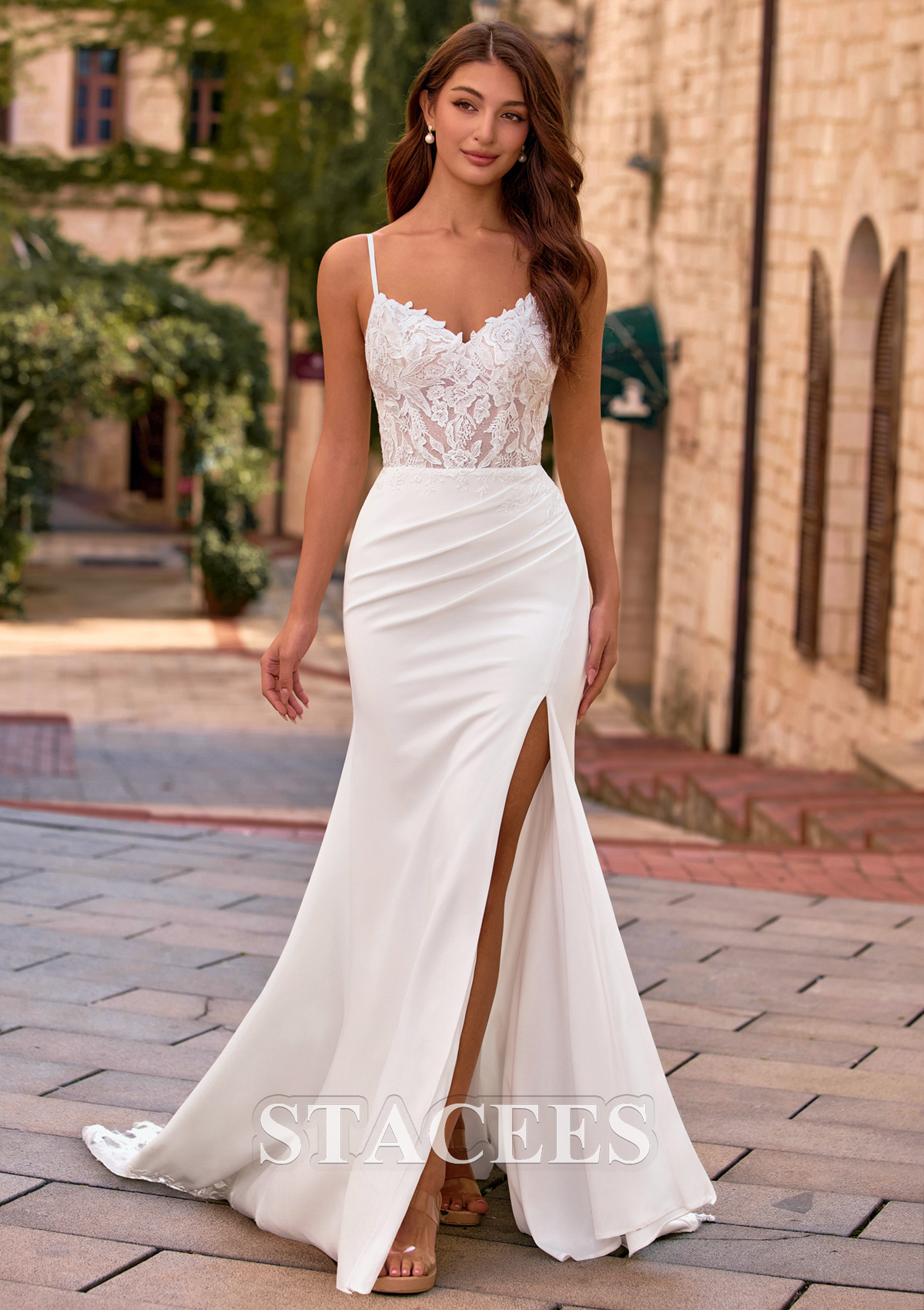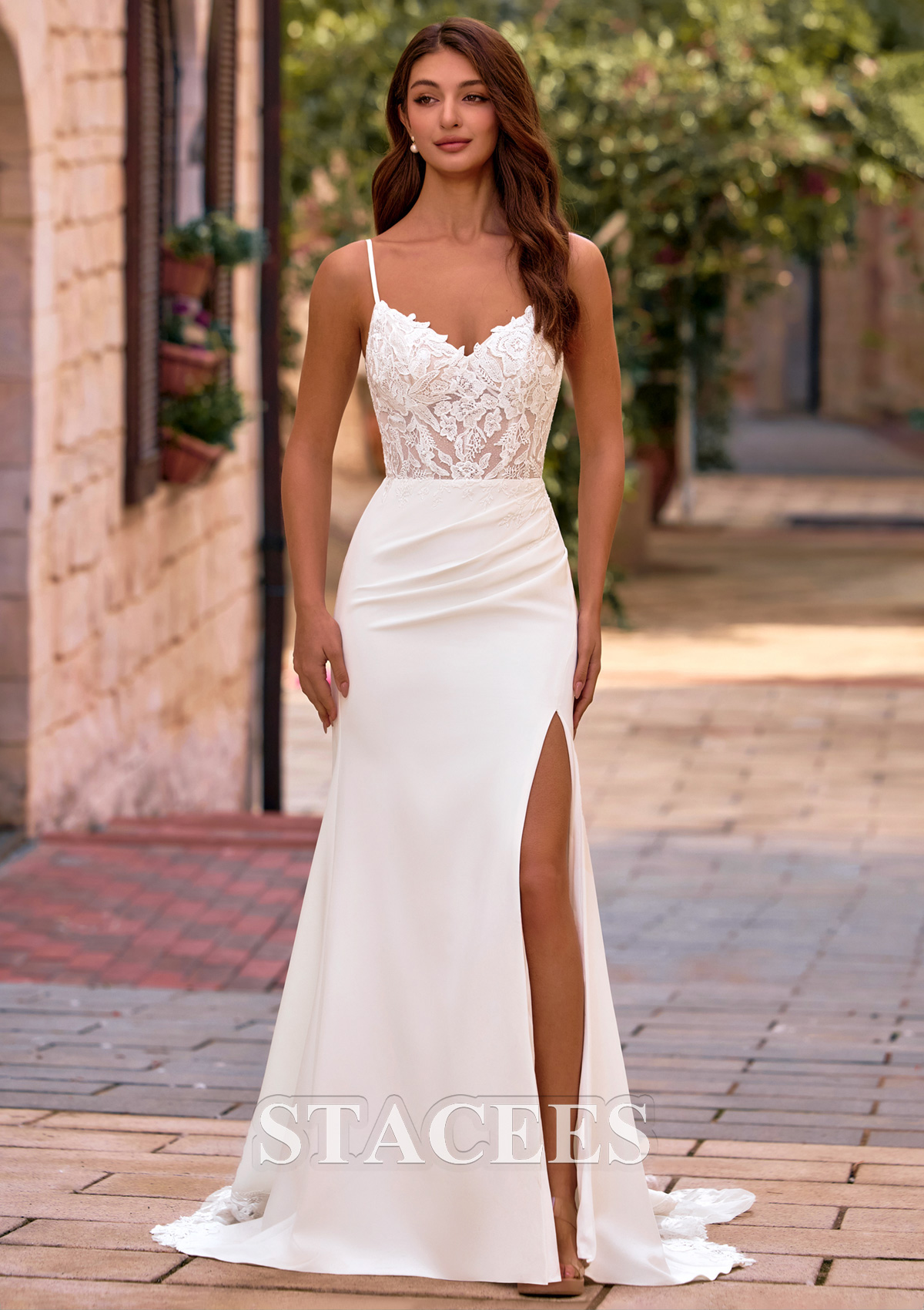 Graceful elegance meets modern bridal style in this stunning wedding dress. Delicate spaghetti straps and a flattering V Neck highlight the neckline, while the fitted lace bodice beautifully enhances natural curves. A sleek mermaid silhouette flows smoothly into a soft skirt with a stylish thigh-high slit, adding movement and a touch of contemporary allure. The back features a romantic low V design that enhances the feminine silhouette, while the lace appliqué train creates an elegant and memorable finish. Perfect for brides seeking a modern, sophisticated, and effortlessly romantic wedding look.
