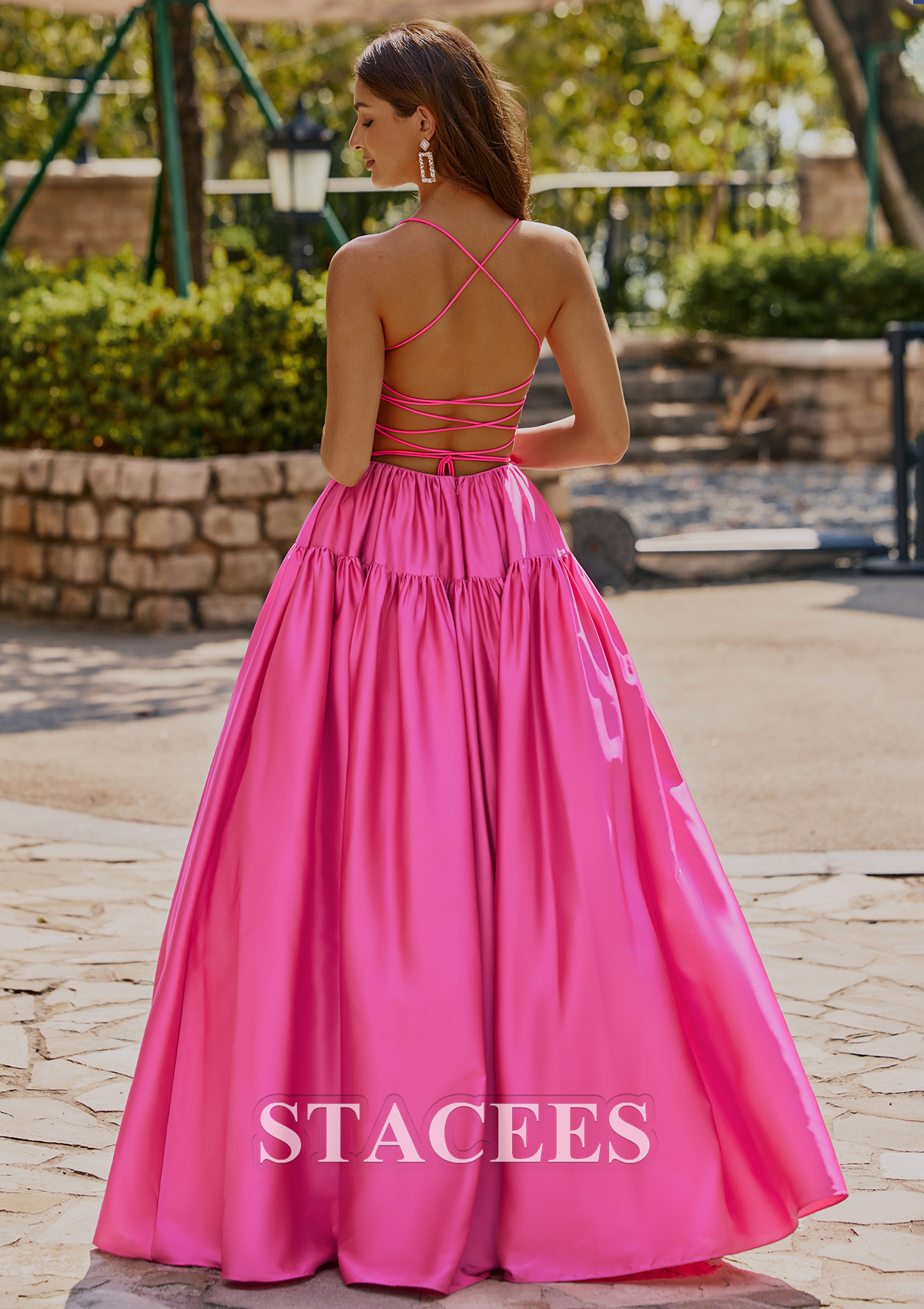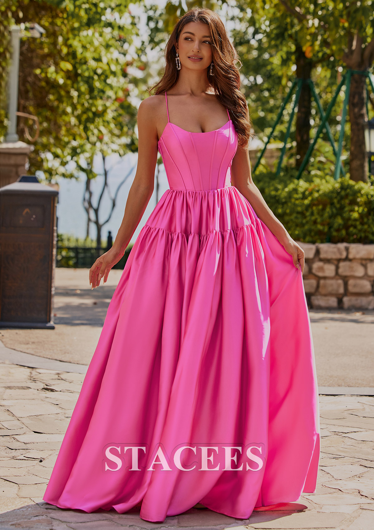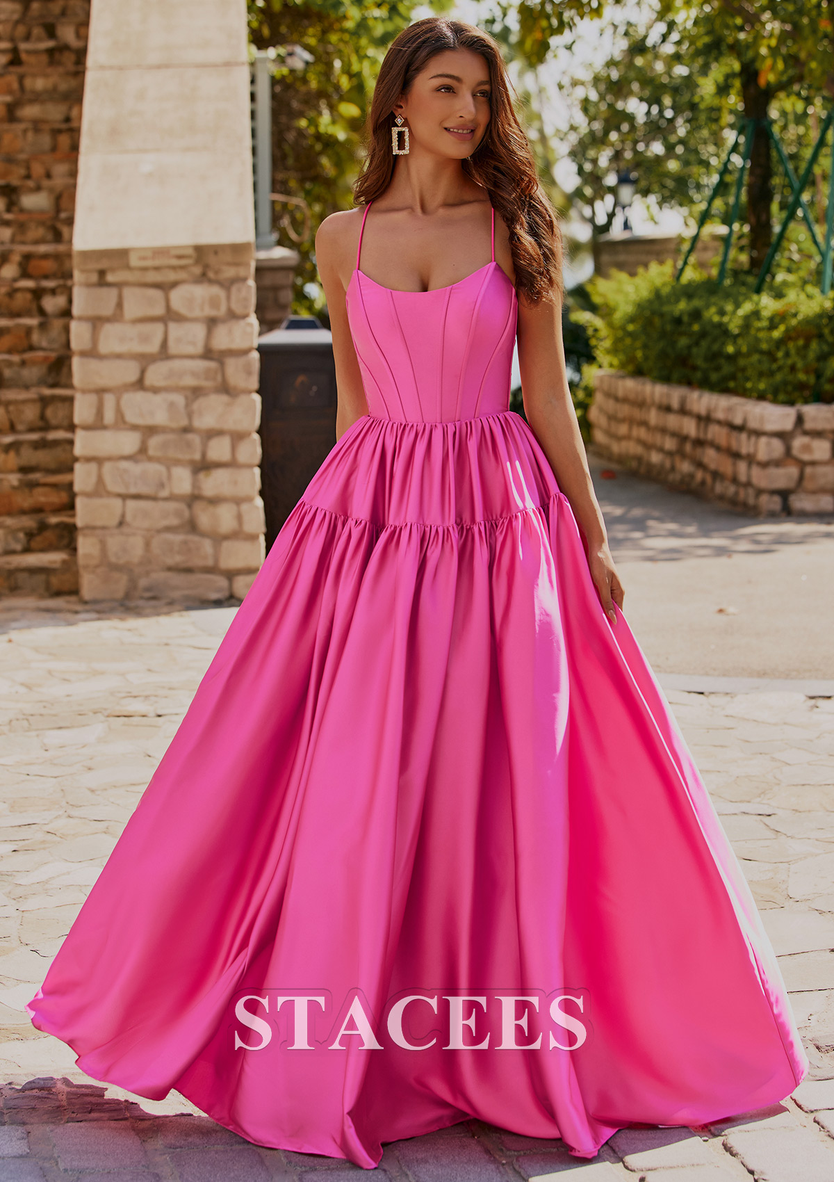 This eye-catching prom dress features a vibrant hot-pink satin fabric that gives off a smooth, glossy shine. The bodice has a fitted, structured look with delicate spaghetti straps that create a flattering neckline. The skirt is full and voluminous, gathered at the waist for a classic ball-gown silhouette that flows beautifully as you move.