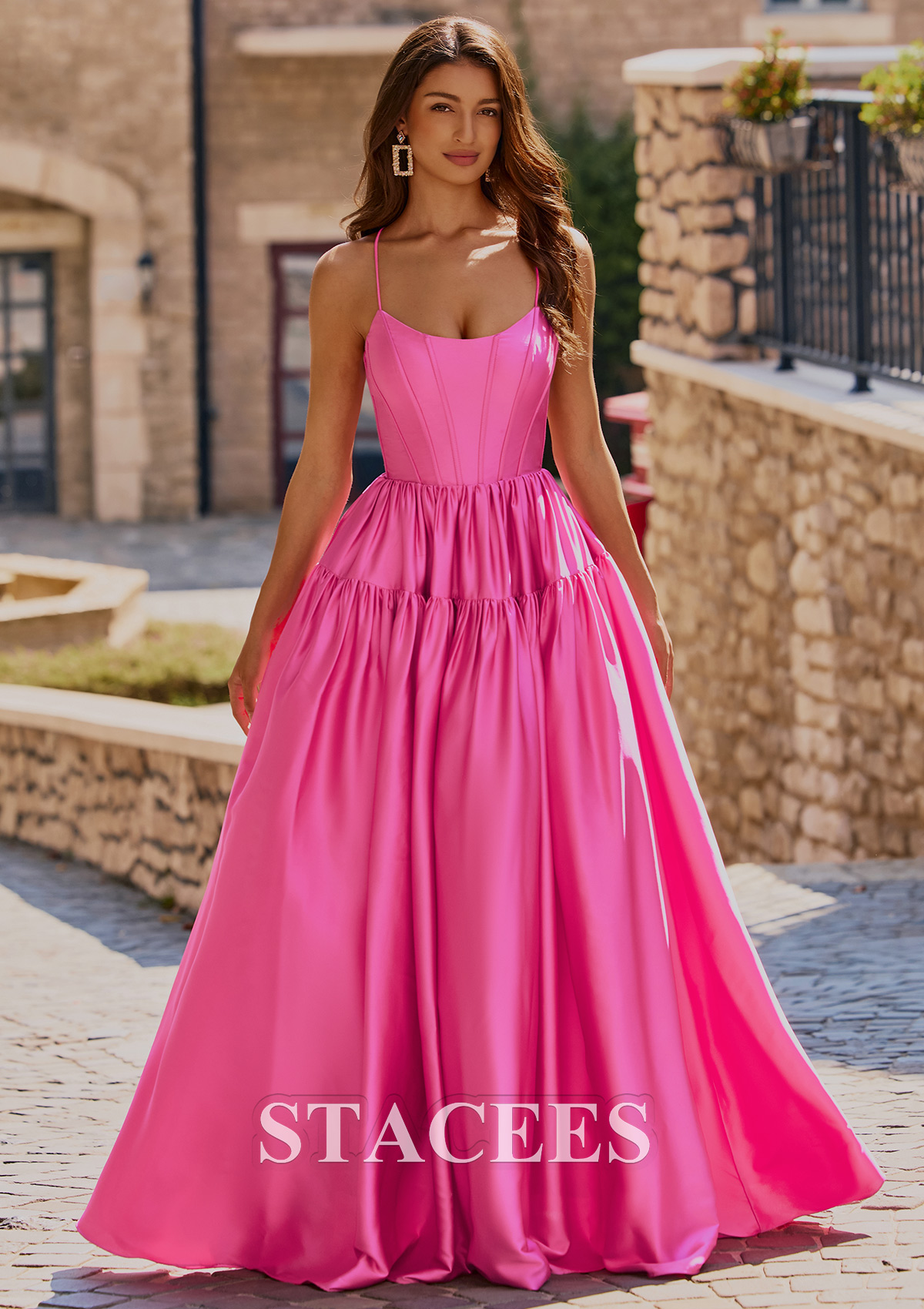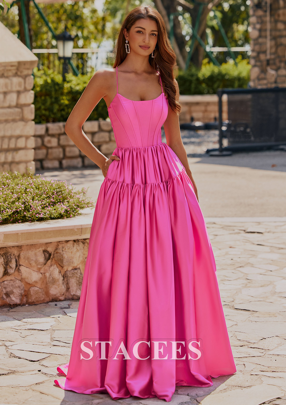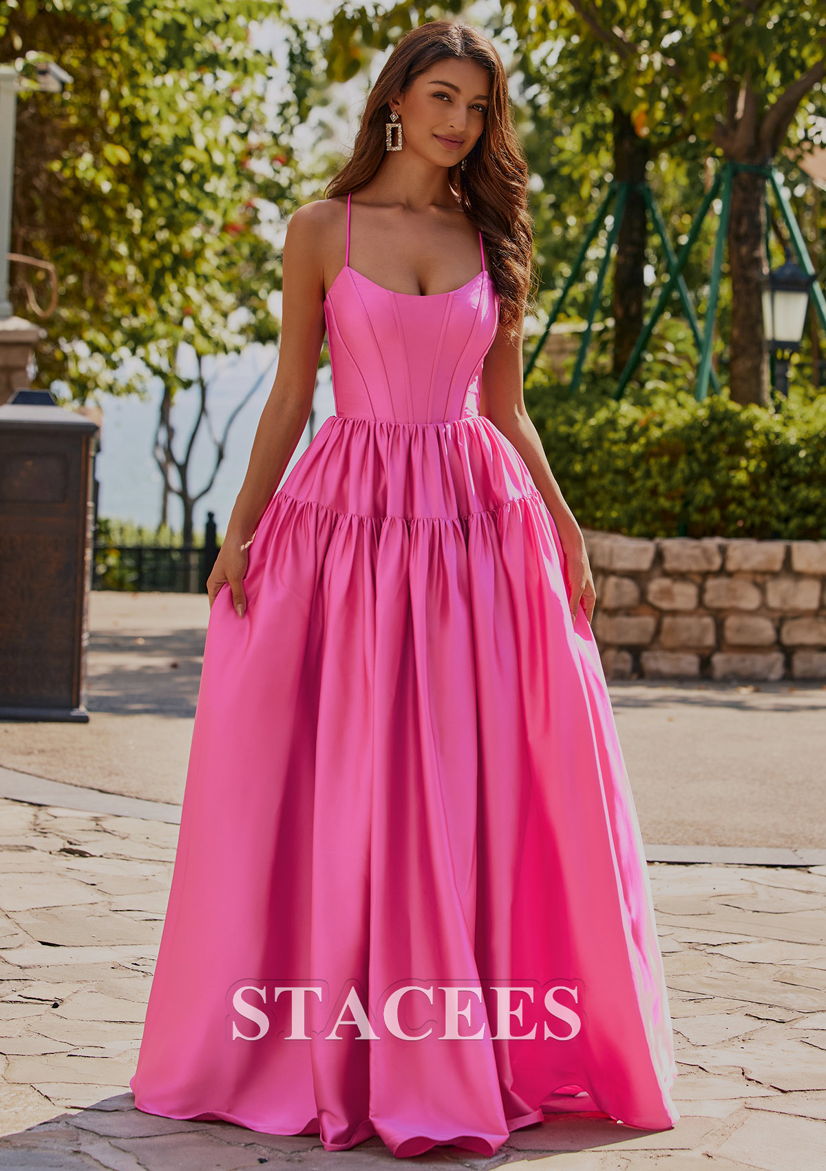 This eye-catching prom dress features a vibrant hot-pink satin fabric that gives off a smooth, glossy shine. The bodice has a fitted, structured look with delicate spaghetti straps that create a flattering neckline. The skirt is full and voluminous, gathered at the waist for a classic ball-gown silhouette that flows beautifully as you move.