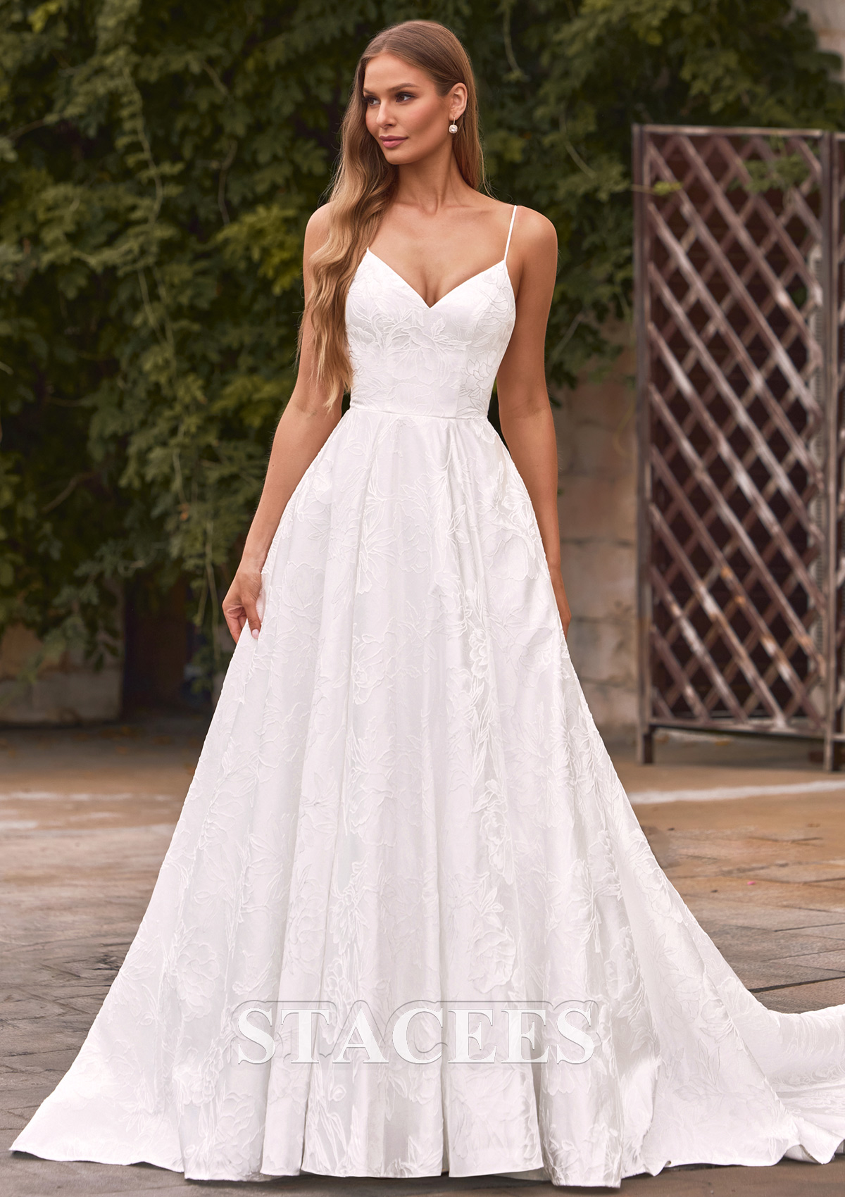 Graceful and enchanting, this classic A-line wedding gown features a delicate floral jacquard pattern that gracefully adorns every inch of its luxurious fabric. Designed with a soft V-neck and slender spaghetti straps, the corset bodice of this bridal gown hugs the figure beautifully, accentuating your silhouette before flowing into a voluminous, floor-sweeping skirt with a graceful chapel train. Perfect for a romantic outdoor ceremony or an opulent church wedding, this bridal masterpiece combines classic charm with modern sophistication. Step into your fairy tale moment with this dreamy, floral-embellished jacquard gown that turns heads and captures hearts.