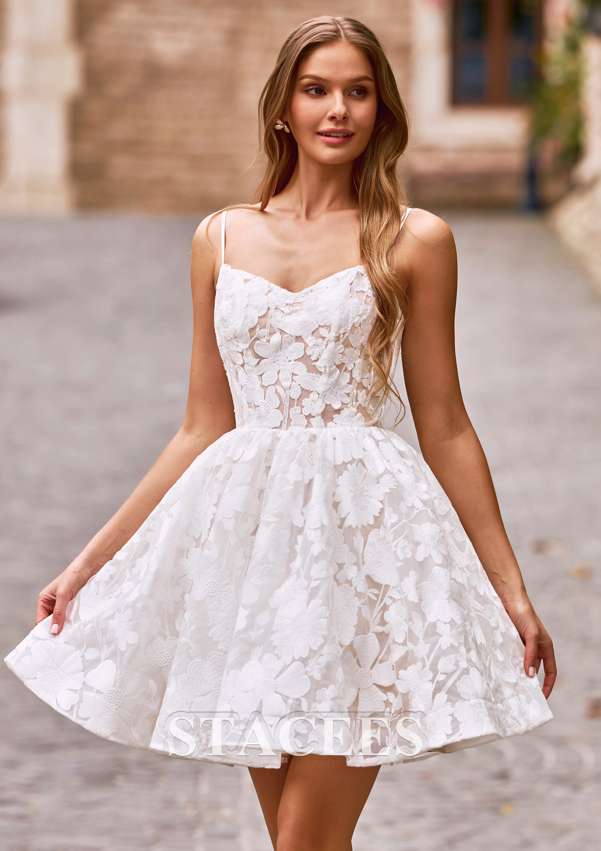 Elevate your bridal style with timeless elegance and capture hearts in this stunning mini A-line wedding dress, a perfect blend of modern flirtatiousness and classic romanticism. The entire garment is adorned with intricate, large-scale floral lace overlays that look beautiful in person and in photography. The front features a delicate V-neckline and thin spaghetti straps that frame the collarbone and shoulders elegantly. The back is the true showstopper, featuring a crisscross lace-up corset detail over a sheer lace panel.
