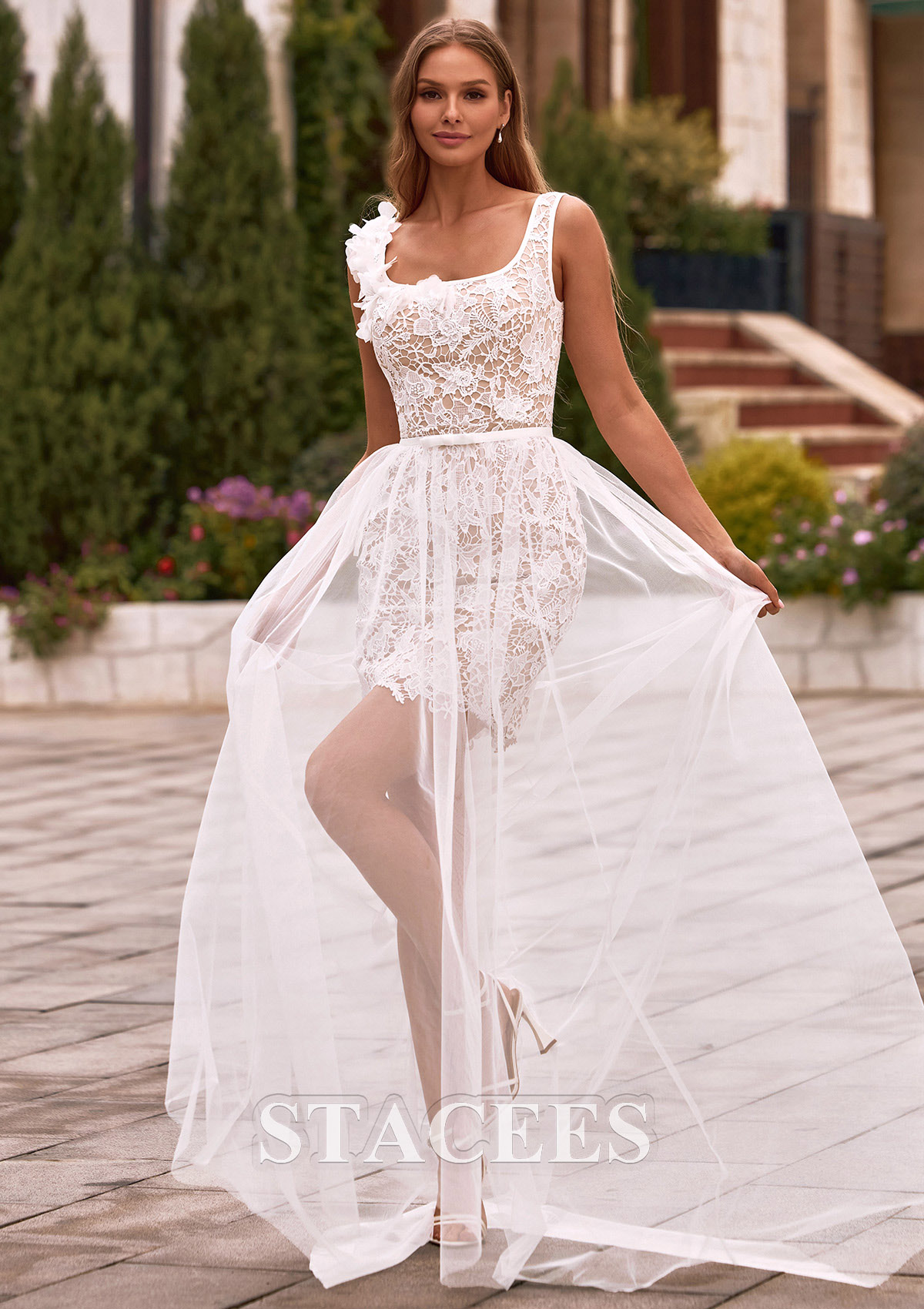 Sheath/Column Square Neckline Tulle Detachable/Knock-down Wedding Dress with Lace Flowers Waistband S3160WT - Wedding Dresses - Stacees