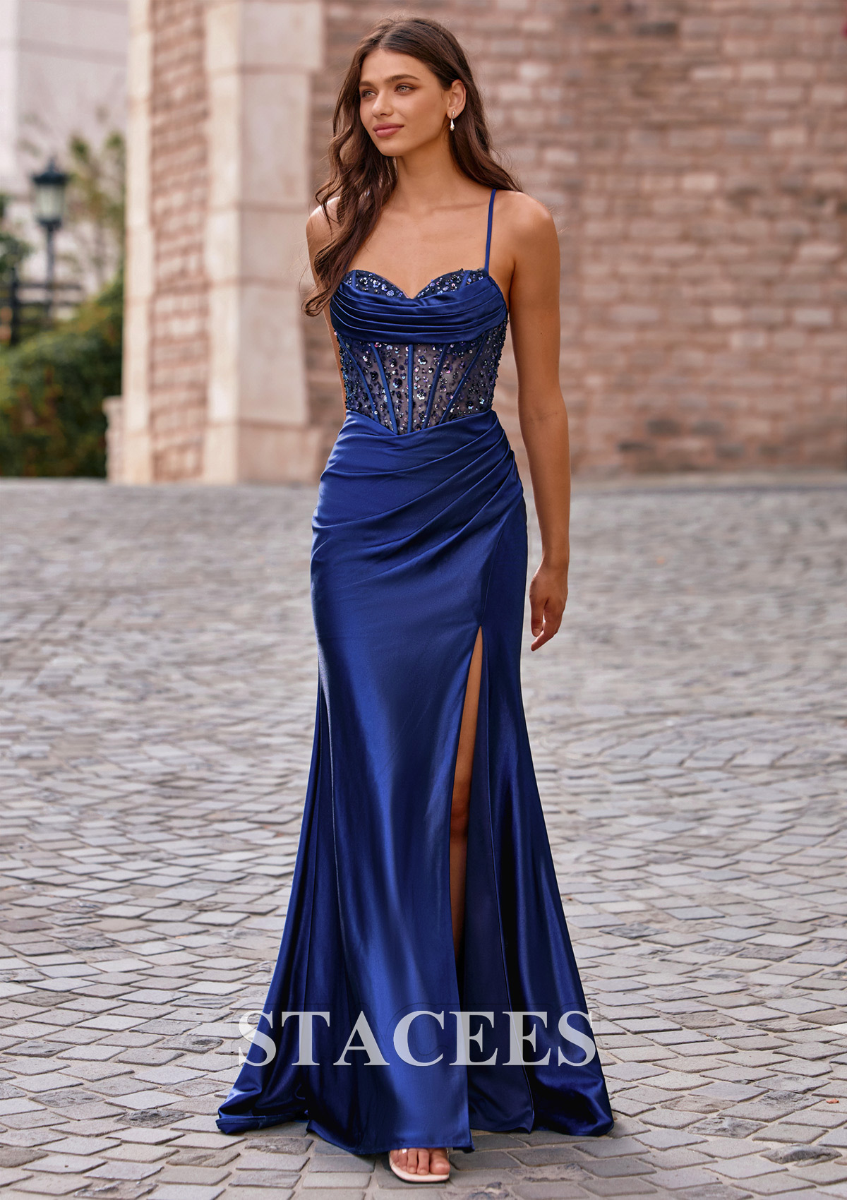 Command attention in this stunning breathtaking prom dress, a perfect blend of modern glamour and classic elegance. This mermaid-style gown features a dazzling, fully embellished sheer-corset bodice that sparkles with sequins and beading. With delicate spaghetti straps and a sweetheart neckline, this gown offers both elegance and a modern edge. The luxurious, silk-like stretch satin skirt hugs your curves, offering a flattering silhouette with a chic, leg-revealing side slit and elegant sweep train. The lace-up open back adds an adjustable fit and dramatic finish, making it an unforgettable choice for prom, formal military balls, or any black-tie event.