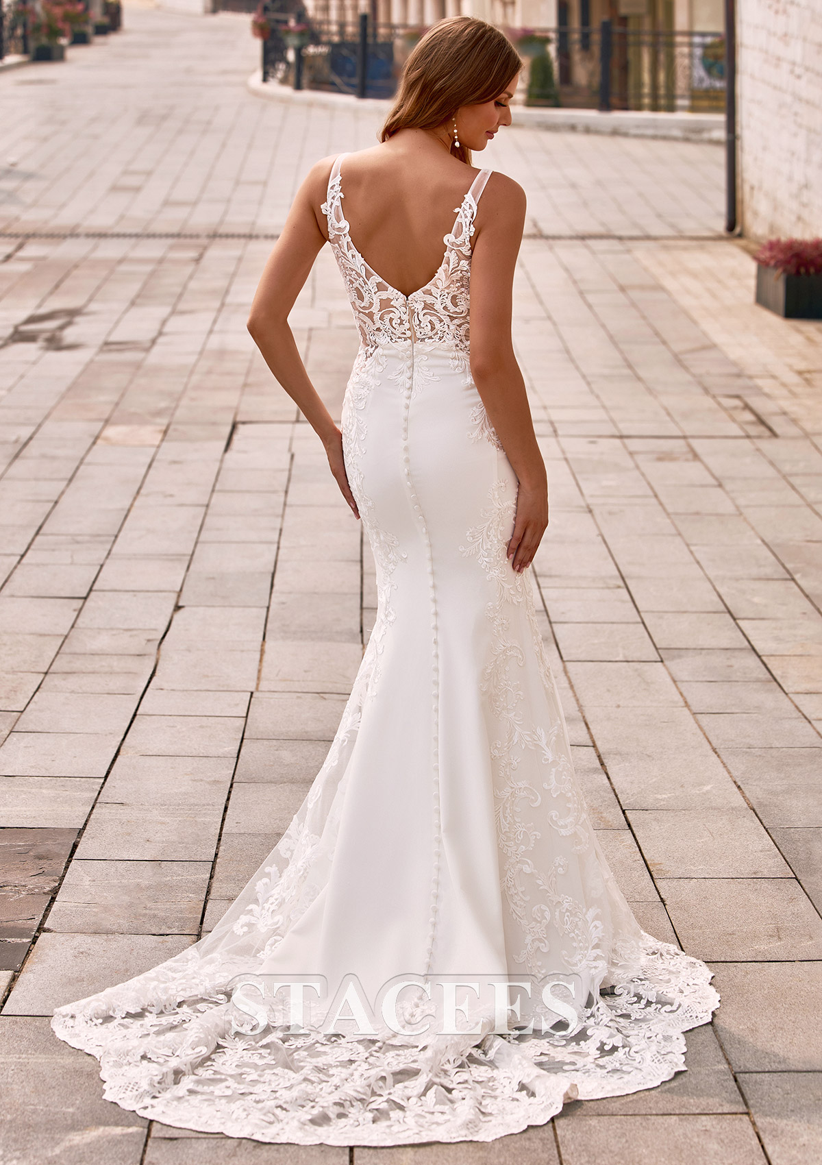 This stunning lace mermaid dress features a romantic deep V Neck and a delicate illusion bodice, beautifully showcasing elegance and feminine allure. Exquisite lace adorn the entire dress, adding texture and sophistication, while the refined lace train creates graceful movement with every step. The back is designed with a low V-cut and detailed button accents, enhancing its classic and luxurious appeal. Perfect for prom, evening parties, red carpet events, and other formal occasions, this gown ensures you stand out as the center of attention.