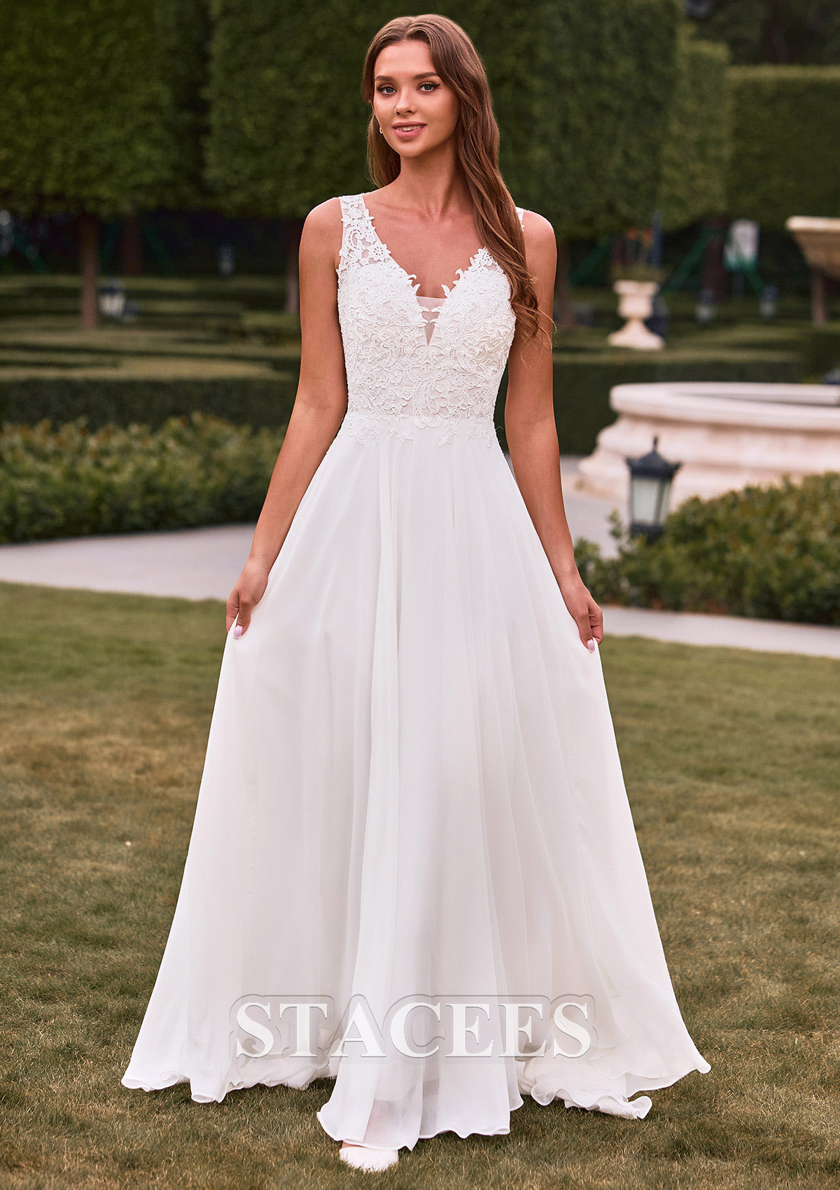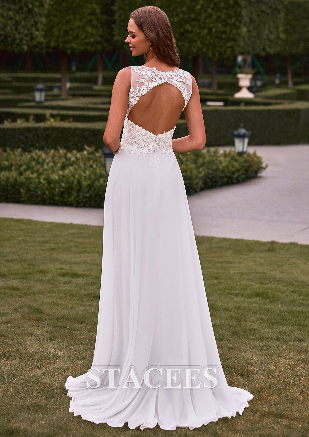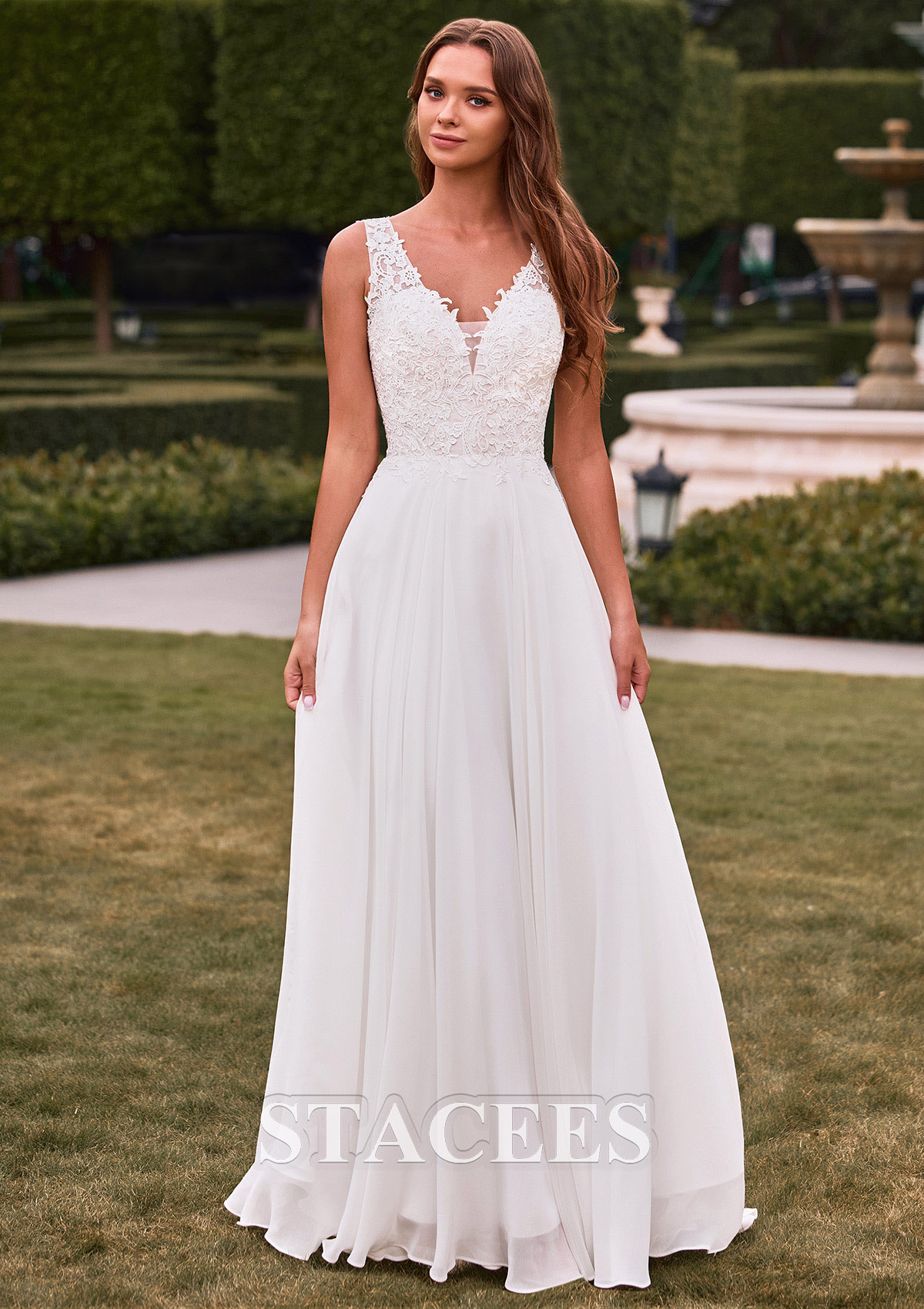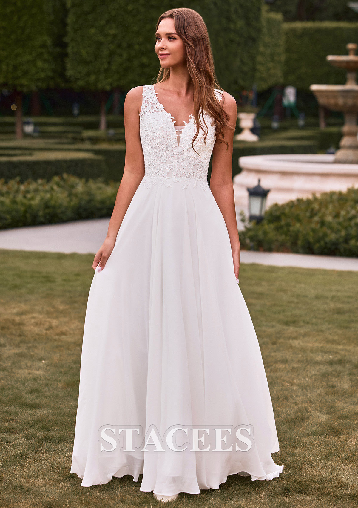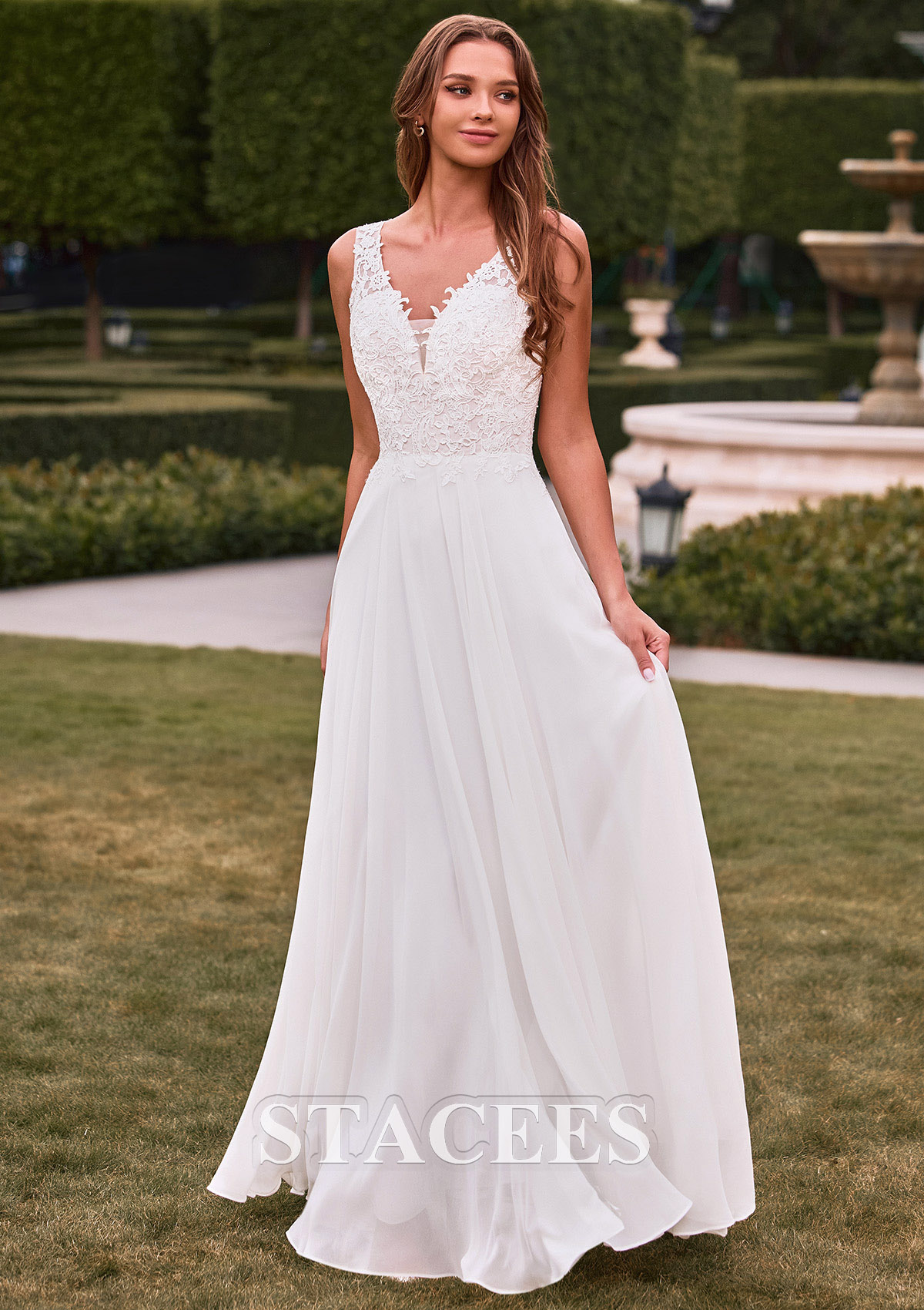 Vestido línea a escote en v gasa cola de barrido vestido de novia S3185W - Vestidos de novia - Stacees.es