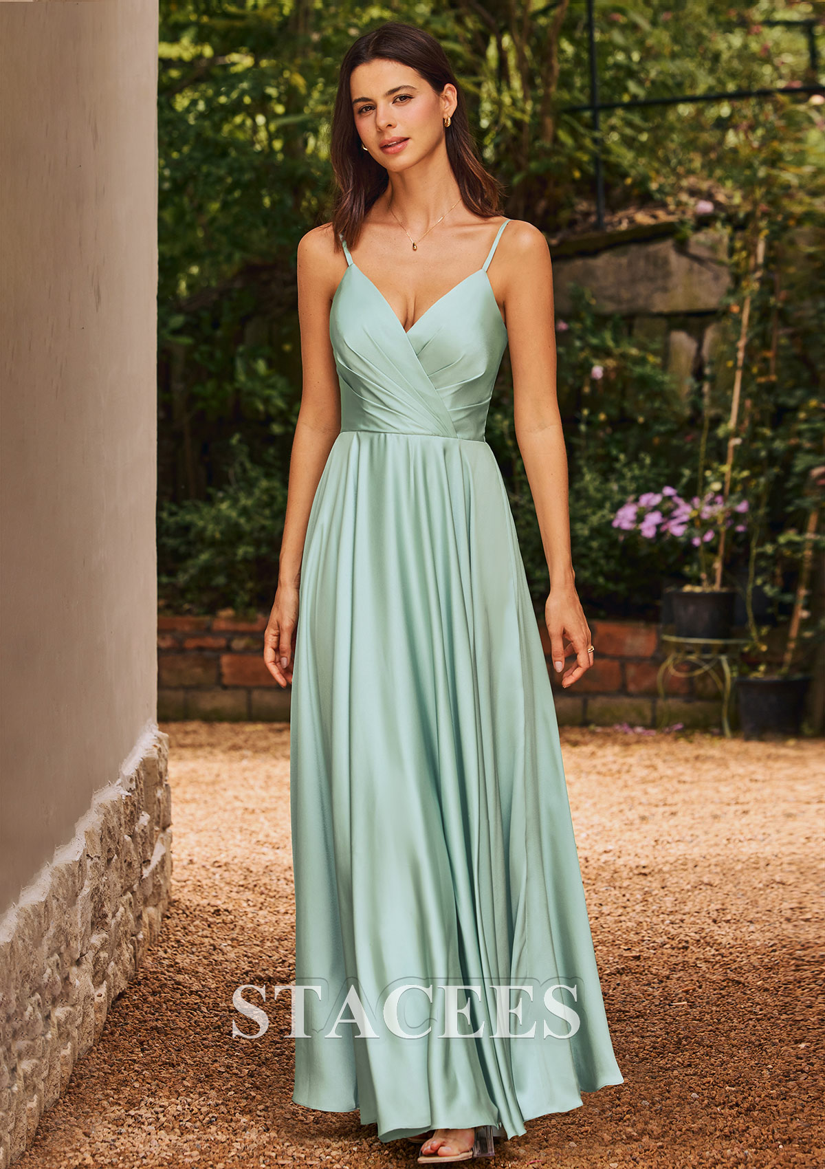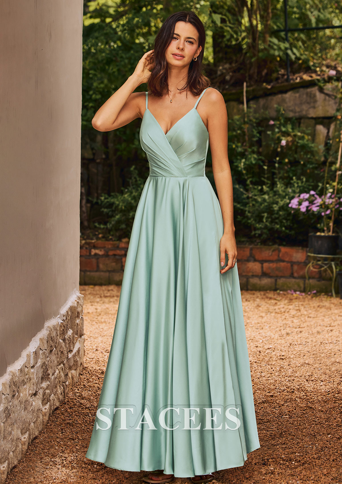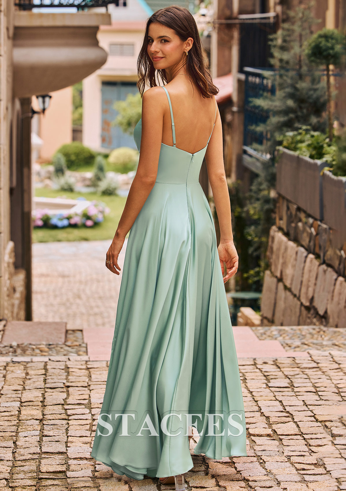 Vestido línea a escote en v satén elástico hasta el suelo vestido de dama de honor S6055B - Vestidos de dama de honor- Stacees.es